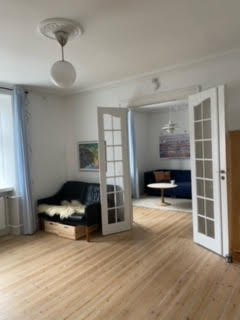 Vi sælger vores lejlighed, der består af tre rummelige værelser, et køkken med spiseplads og et udbygget badeværelse. Lejligheden har tidligere været haft fire værelser.