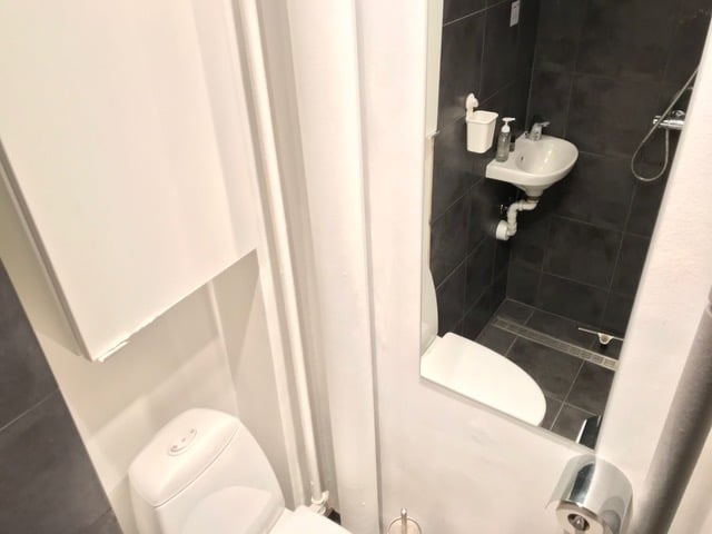 Der blev i 2013 indsat nyt badeværelse (udvidet areal) med store mørke klinker, nyt brusesæt m. unidrain, toilet, vask og blandingsbatteri.