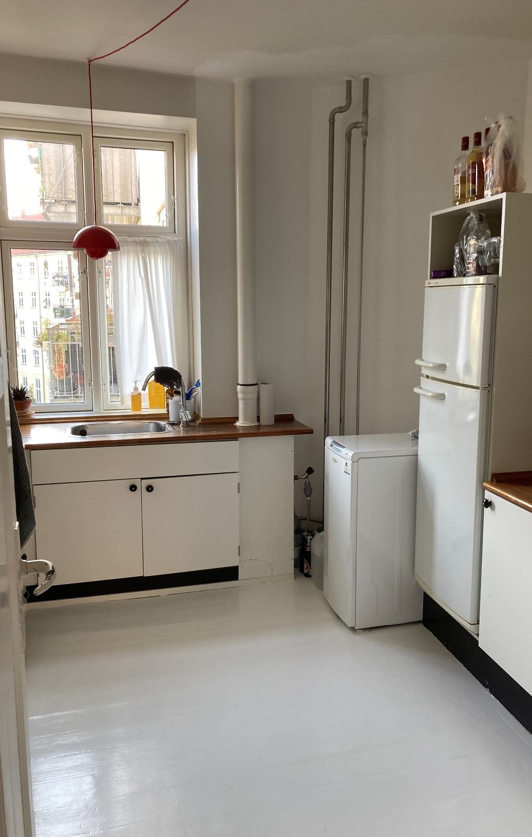 Lejligheden består af et ældre lyst og funktionelt køkken, et toilet samt et større badeværelse. Herudover to fine, lyse værelser der kan tilgås fra en lang fordelingsgang som desuden har et relativt stort opbevaringsrum for enden.